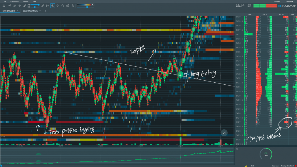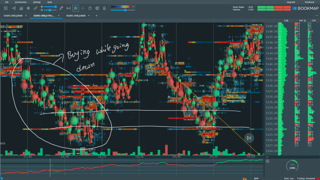 - Aggressive Absorption: Large green bubbles visible on a downtrend, confirming aggressive professional buying “buying while going down.”