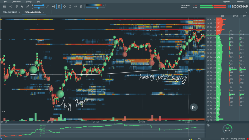 - Big Buyer Absorption: strong aggressive buy reaction after selloff reversal.